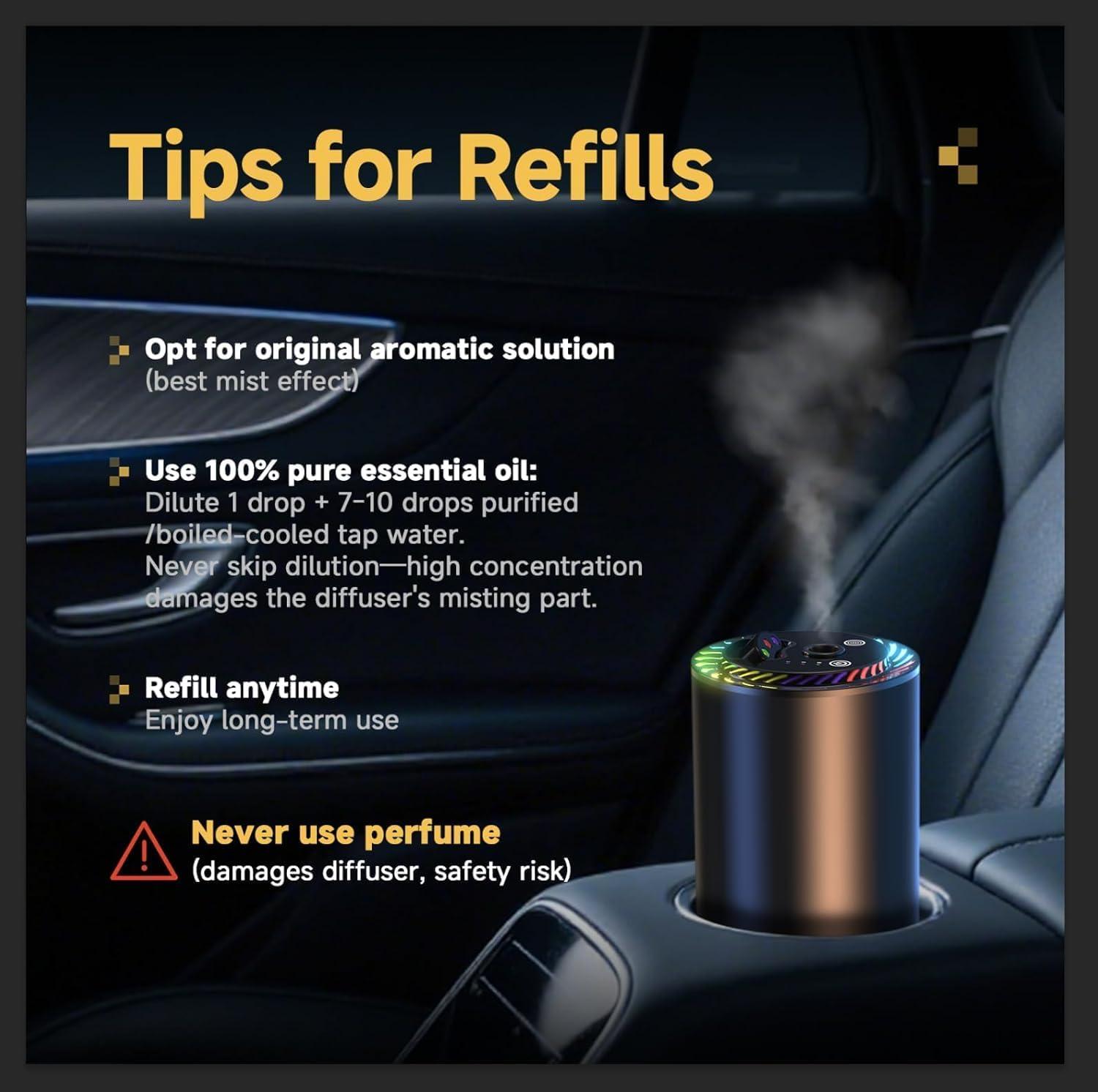 Automatic Switch-Off & Easy to Use:The smart car air freshener intelligently detects vehicle motion. It automatically turns on when you get in the car and enters standby mode 10 minutes after you exit, stopping fragrance release. This hassle-free design ensures efficiency and energy saving for daily use with your car air freshener diffuse